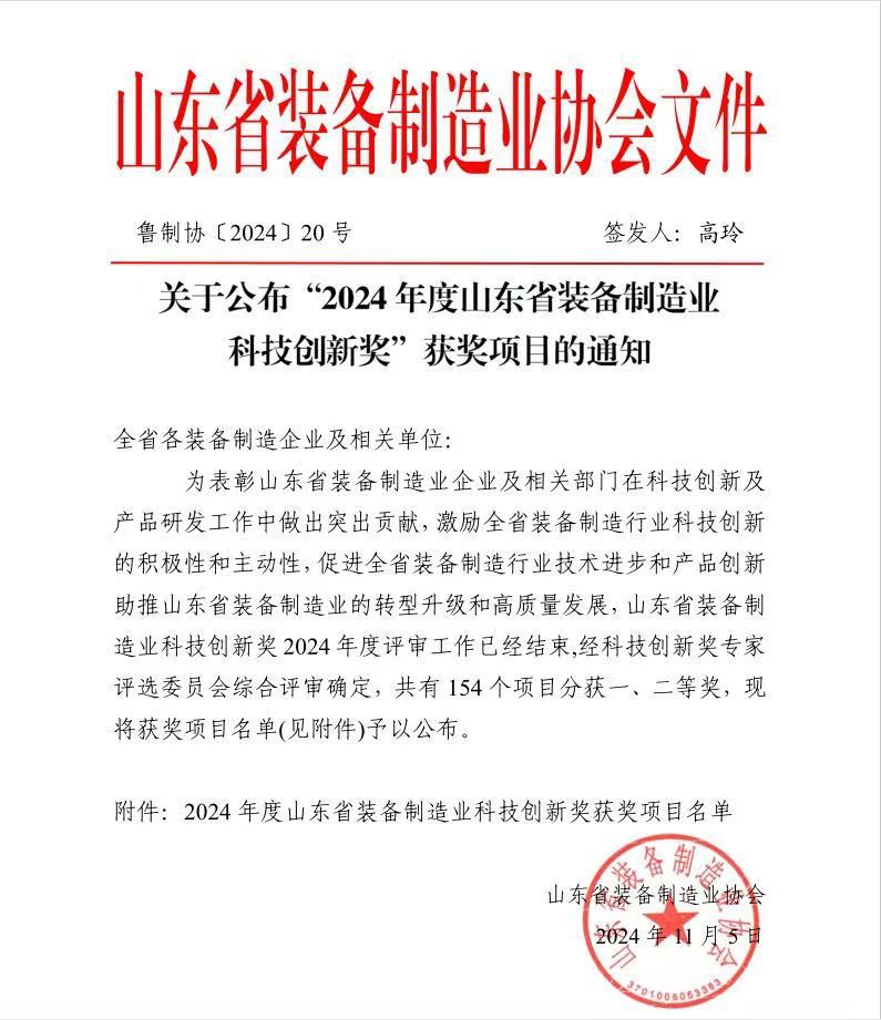“2024 年度山東省裝備制造業(yè)科技創(chuàng)新獎”二等獎。