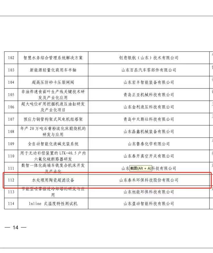 祝賀公司產(chǎn)品“水處理用陶瓷超濾設(shè)備”評為“2024年度山東省裝備制造業(yè)科技創(chuàng)新獎”二等獎